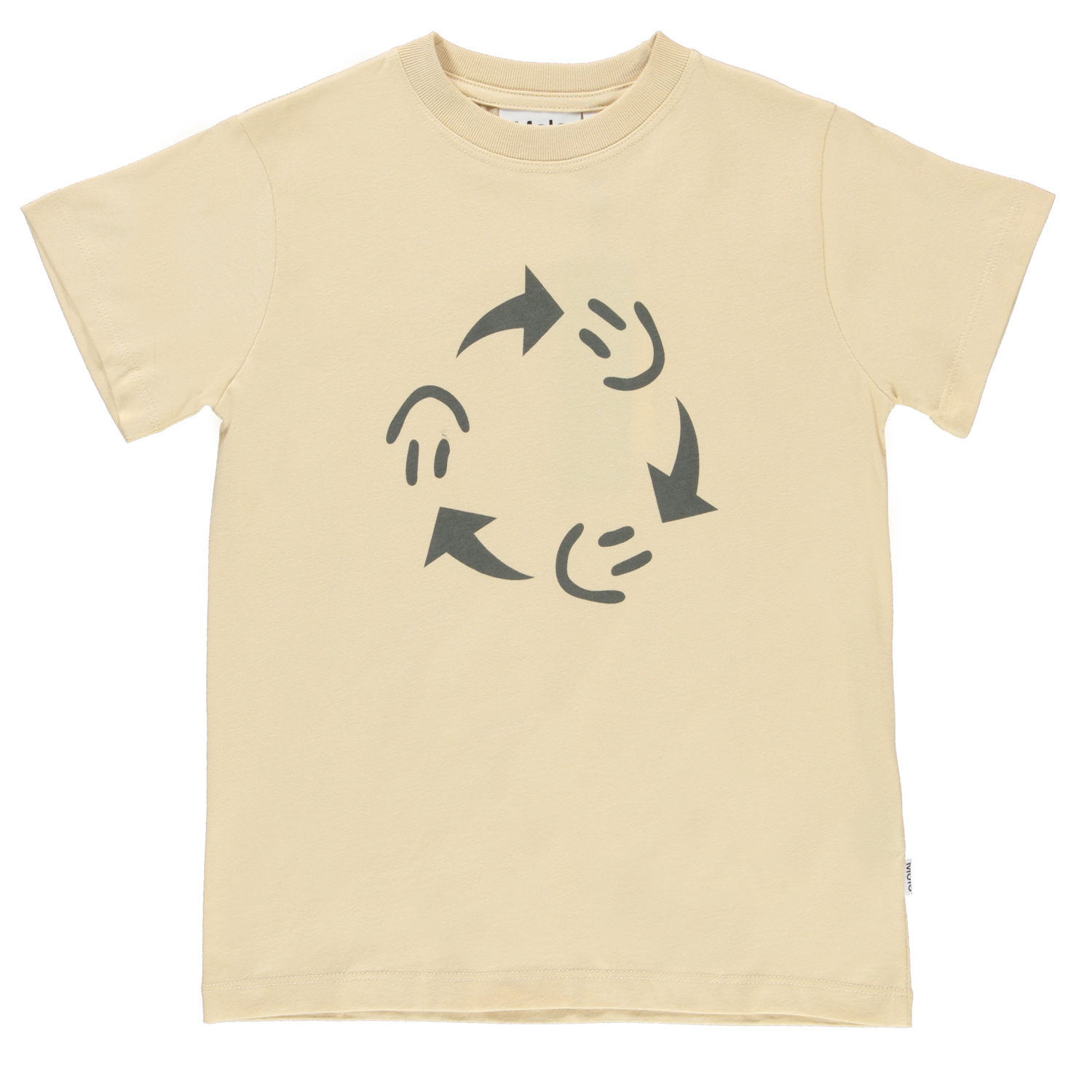 Road is een lichtgele t-shirt met een print van smileys die in een cirkel gaan.