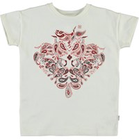 Robine is een wit t-shirt met een rode Paisley print op de voorkant. Het t-shirt heeft een ronde hals.