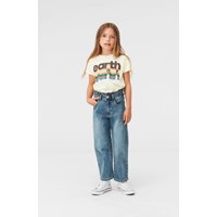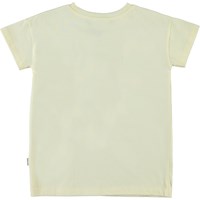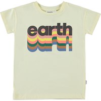 Robine is een lichtgele t-shirt met op de borst 'Earth' gedrukt in regenboogkleuren.