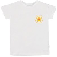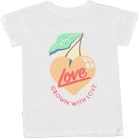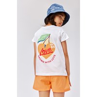 Robine is een wit t-shirt van biologisch katoen. Op de borst staat een kleine zon en op de achterkant staat een print van een grote perzik in de vorm van een hart en een boodschap van liefde.