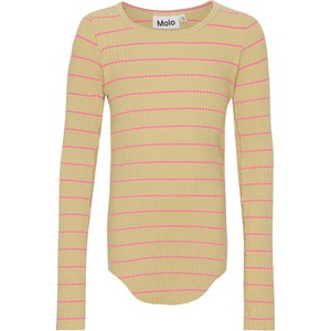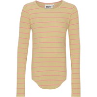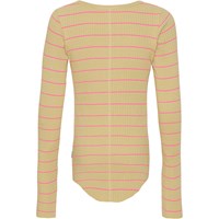 Rochelle is een rib top met lange mouwen. Het is iets langere aan de voor- en achterkant en heeft onafgewerkte randen aan de mouwen en onderkant. De top heeft leuke en coole roze strepen op een oud gele achtergrond. Rochelle heeft een slanke pasvorm waardoor het perfect is om alleen of onder een andere stijl te dragen.