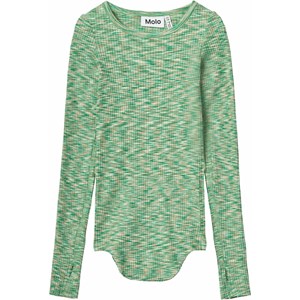 Groene aansluitende kinder longsleeve van elastisch biologisch katoenen ribstof met ronde hals en onafgewerkte boorden aan beide mouwen met duimgaten. Longsleeve heeft een verticale naad midden op de rug en onbewerkte afgeronde boord aan de onderkant. De longsleeve is een prachtige geweven stof in groene, witte en lichtbruine kleuren.