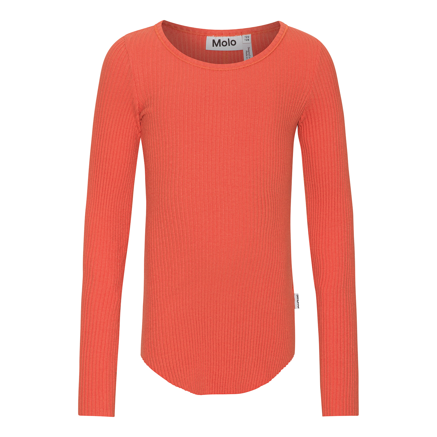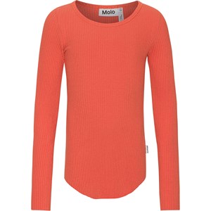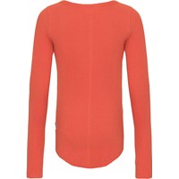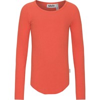 Rode top met lange mouwen in een zacht biologisch katoen met duurzame rib. De top is aansluitend en heeft een ronde hals. Het heeft ruwe boorden aan de mouwen en duimgaten. Er zijn verticale stiksels middenachter en een afgeronde zoom.