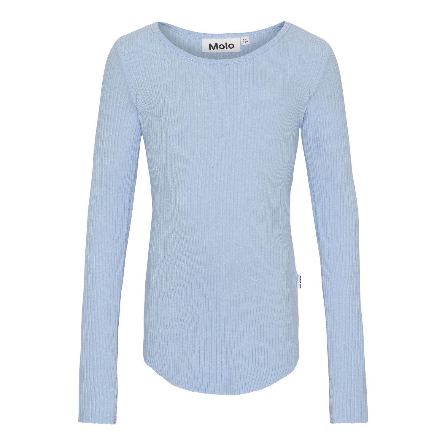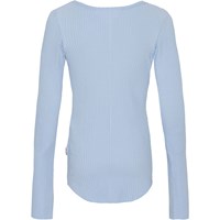 Rochelle is een lichtblauwe rib top met lange mouwen. Het is iets langere aan de voor- en achterkant en heeft onafgewerkte randen aan de mouwen en onderkant. Rochelle heeft een slanke pasvorm waardoor het perfect is om alleen of onder een andere stijl te dragen.