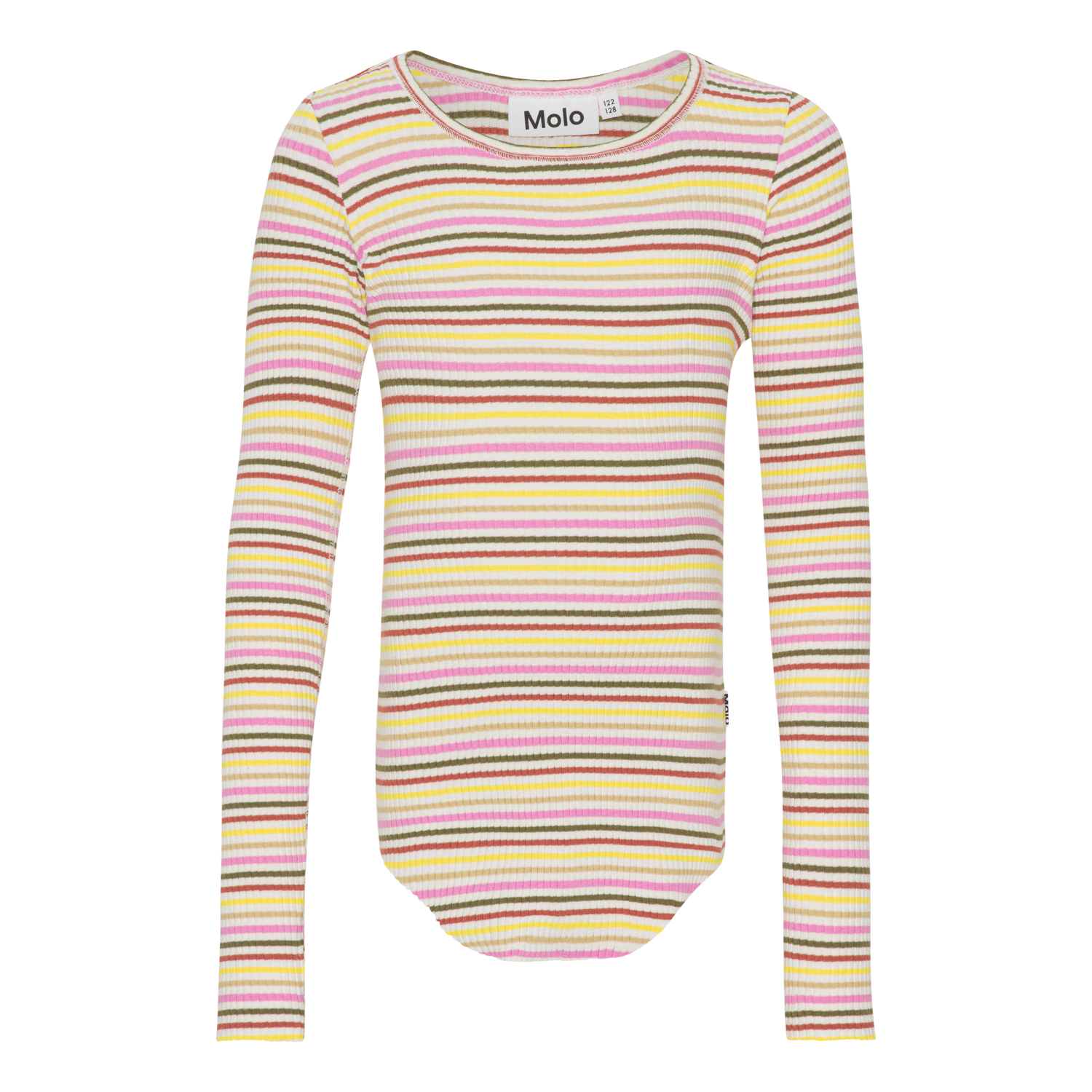 Rochelle is een rib top met lange mouwen. Het is iets langere aan de voor- en achterkant en heeft onafgewerkte randen aan de mouwen en onderkant. De top is in leuke en coole veelkleurige strepen. Rochelle heeft een slanke pasvorm waardoor het perfect is om alleen of onder een andere stijl te dragen.