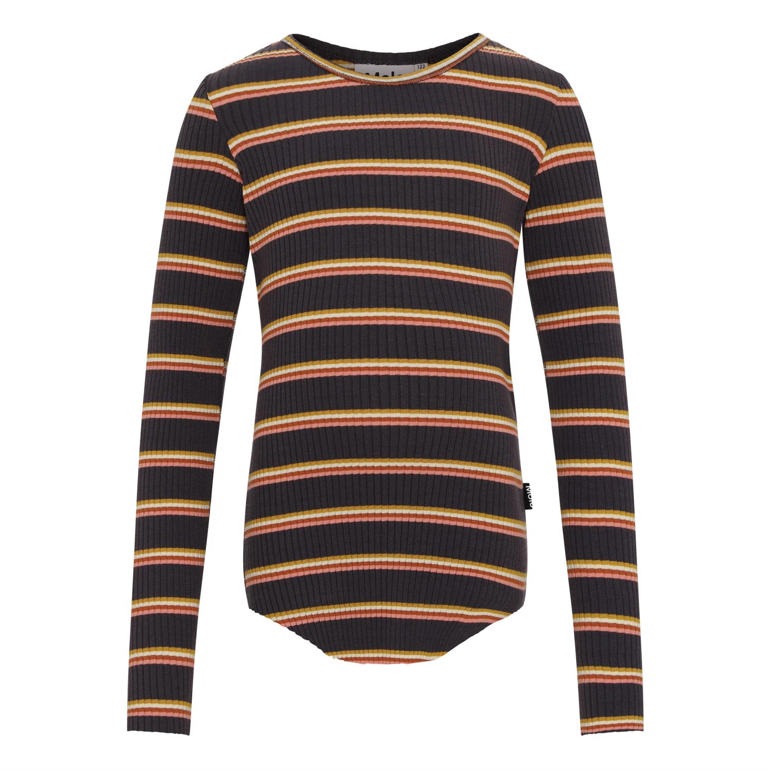 Rochelle is het perfecte shirt waar je geen genoeg van kunt krijgen. Rochelle is in bruin met smalle strepen in lichtroze, geel en bruin. Het shirt is van ribkwaliteit en heeft duimgaten.