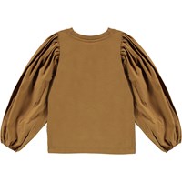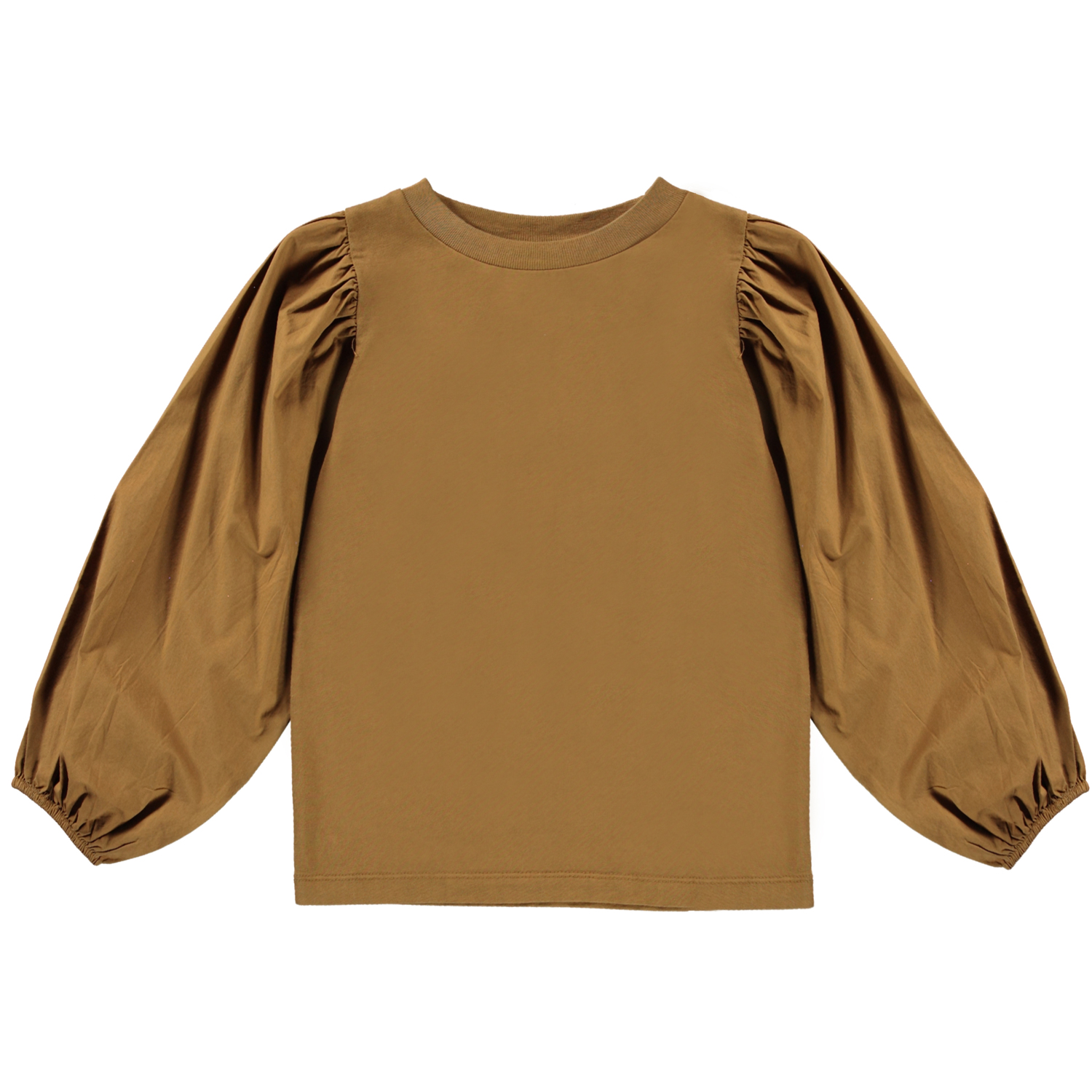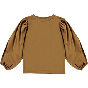 Rominda is een bruine katoenen top met grote, volumineuze mouwen die een prachtig silhouet geven.