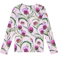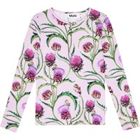 Paarse shirt van biologisch katoen met lange mouwen. Het heeft een aansluitende pasvorm en een ronde hals. Het shirt heeft een kleurrijke print van artisjokbloemen in de kleuren rood, paars en groen.