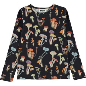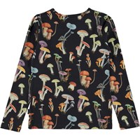 Zwarte longsleeve met een paddenstoelenprint. De print is van een assortiment prachtige paddenstoelen die zijn verzameld tijdens een herfstwandeling in het bos. Het is grafisch, eenvoudig en mooi. De longsleeve is van 100% katoenen jersey, heeft een ronde hals en een normale pasvorm.