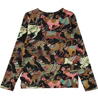 Zwarte longsleeve met een lama print. De humoristische print toont twee lama's die Molo's eigen breiwerk dragen, en ze dragen allebei een muts, een infinity sjaal en een trui. De longlseeve is van 100% katoenen jersey, heeft een ronde hals en een normale pasvorm.