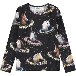 Zwartelongsleeve gemaakt van biologisch katoen met een ronde hals en mooie afgewerkte boord. De longsleeve zit aanlsuitend en heeft een print van eenhoorns met kleurrijke bloemenkransen.