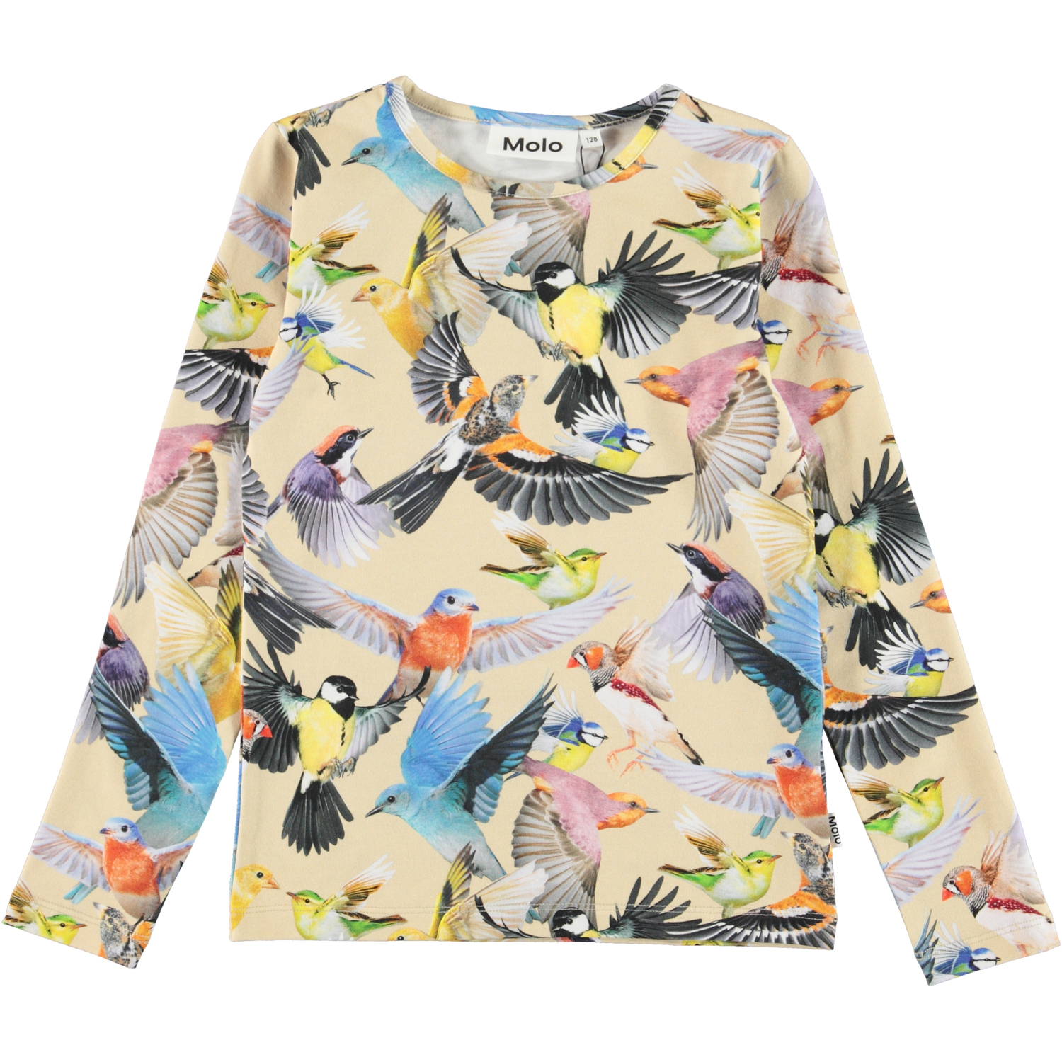 Rose is een lichtgele longsleeve met een print van verschillende kleurrijke vogels.