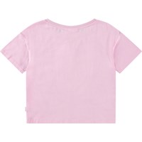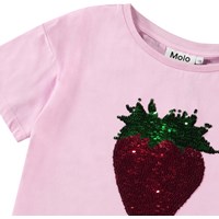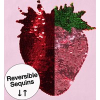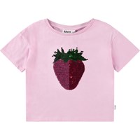 Oversized roze t-shirt van biologisch katoen met ribboord rond de hals. Het t-shirt heeft op de voorkant een omkeerbare pailetten van een aardbei.