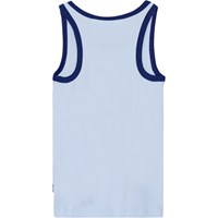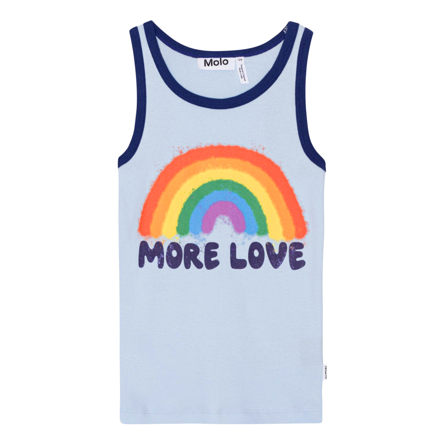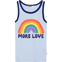 Lichtblauw aansluitend hemdje van biologisch katoen. Het hemdje heeft een donkerblauwe boord rond de hals en armsgaten en onze iconische regenboog met op de voorkant de tekst 'More Love'.