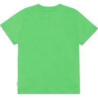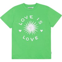 Groene t-shirt van biologisch katoen met een witte print van een zon en de tekst 'More Love'. Het t-shirt heeft een ronde hals en een normale pasvorm.