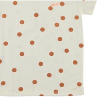 Rozalia is een lichtgekleurde t-shirt met bruine stippen en het roze Molo-logo op de borst.