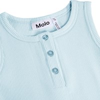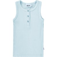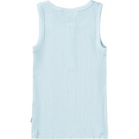 Lichtblauw aansluitend topje gemaakt van zachte viscose rib met een ronde hals en drie bijpassende knopen aan de voorkant.