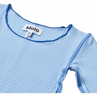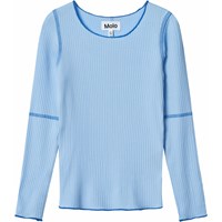 Lichtblauwe longsleeve in zacht rib-viscose met ronde hals. De longsleeve heeft een aansluitende pasvor, ronde hals en onbewerkte donkerblauwe boorden wat een mooi effect geeft.