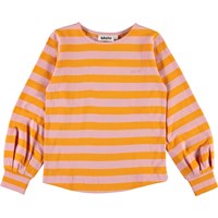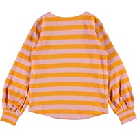 Rylee is een roze en oranje gestreepte shirt. Het heeft volle mouwen en elastische ribboorden aan de onderkant.