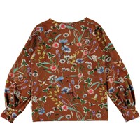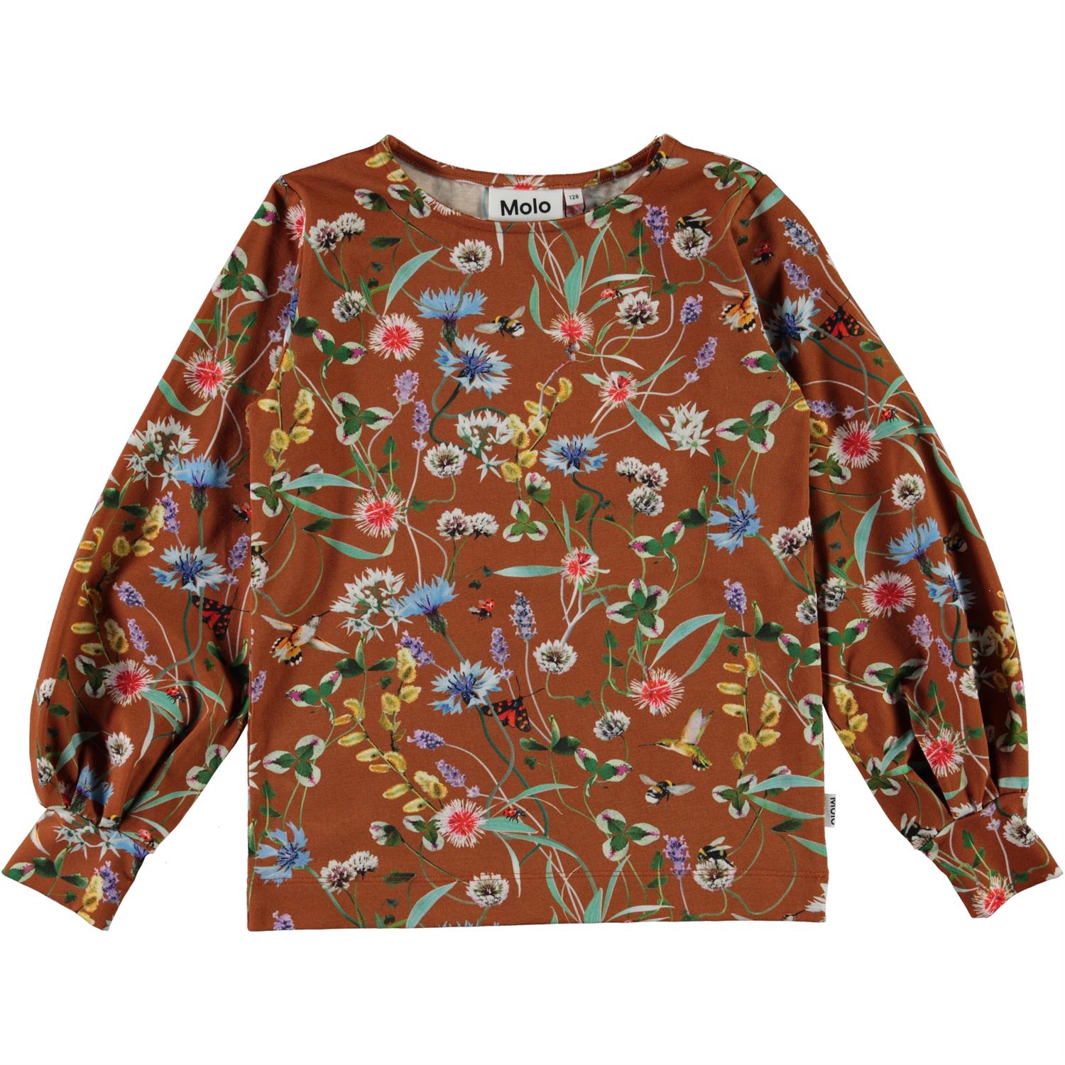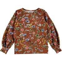 Ryle is een bruine shirt met lange mouwen en een print van wilde bloemen en kleine insecten. Het shirt heeft wijde mouwen met elastische ribboord rond de mouwen.